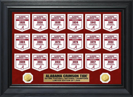 A limited edition of only 1000, is the commemorative deluxe championship banner collection. Featured in a black 18" x 22" wood frame with 2.5" wide molding and suede double matting under a protective acrylic glass panel are commemorative championship banners representing each of the College Football National Championship games won. Included under the banners is two 39mm in diameter minted commemorative coins. Each minted coin is carefully plated with 24KT Gold. Engraved nameplate is featured between both minted coins. A certificate of Authenticity accompanies each collectible frame. Officially licensed by CLC and proudly made in the USA by The Highland Mint!