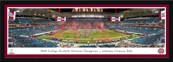 A beautiful shot of the second that the Alabama Crimson Tide finished their 18th National Championship Season - This was an undefeated season for Alabama - This win over Ohio State University made them 13-0 - This is a unique season due to the coronavirus pandemic - Officially Licensed Item - Perfect piece of wall decor - Photo dimension is 13"x40.5" - Framing adds a few inches to each side - Team Color Matting