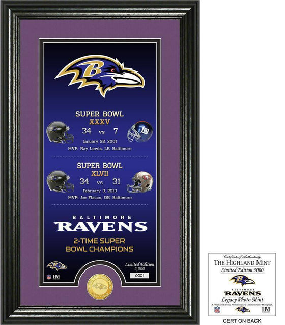 Commemorating the Baltimore Ravens and their 2 Super Bowl Titles! Featured in a 12" x 20" frame with a glass front panel and double matting is a 15" x 7" hand numbered commemorative photo. The photo design includes the the Ravens team logo as well as the Ravens and their opponents dueling helmets with the scores, dates and MVP's from each of their Super Bowl titles. Highlighting this unique collectible frame is a 39mm bronze 2-time Super Bowl Champions coin. This is a limited edition of 5000. Officially licensed by NFL and proudly made in the U.S.A. by The Highland Mint.