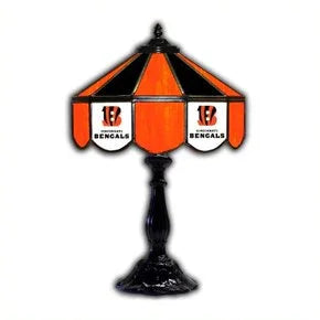 This NFL Officially Licensed Cincinnati Bengals Glass Table Lamp will dress up any room in the house and shows your support of your favorite team. Comes with everything you need - just add one 60 watt light bulb (not included). Artfully handcrafted 14†old world Tiffany style stained glass table Lamp. Fully wired with 1 UL. Approved high quality light socket. Heavy duty solid cast metal base. 6’ of cord with polarized plug. Handmade in the U.S.A. Lamp measures 14†wide X 22†high. Allow 10 days to ship. Ships small parcel. Weighs 13 pounds.