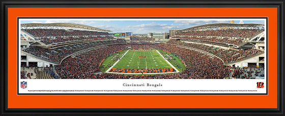 This panorama showcases a Cincinnati Bengals touchdown in front of their home crowd at Paul Brown Stadium. The Cincinnati Bengals joined the American Football League as an expansion team in 1968. By 1970, under direction and guidance of legendary coach Paul Brown, the Bengals won the AFC Central Division to become the first expansion team to win a championship of any kind in just three years. In 1981, sporting a new look, the Cincinnati Bengals advanced to its first of two Super Bowl appearances. Paul Brown Stadium, home venue of the Cincinnati Bengals, is located in the heart of downtown Cincinnati, covers approximately 22 acres and seats 65,535 fans. This panorama was taken by Chris Gjevre.Panoramics are 13.5"x40". When framed, about 2-3 inches are added to each side. Allow 1-3 business days handling time.