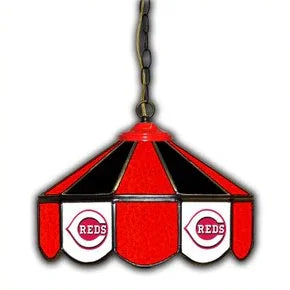 Perfect for over the Bar this Cincinnati Reds 14-in. Stained Glass Pub Light. Beautifully handcrafted 14-inch diameter old world Tiffany style stained glass hanging pub light. Each piece of glass is individually cut by hand and individually placed by hand. It is then soldered into its proper position with great care and precision by highly trained artists. Fully wired with 1 UL Approved high-quality porcelain light socket and a 12-foot cord with inline switch and polarized plug. 9-feet of heavy duty antique brass chain adds a touch of luxury to the lamp. Handmade in the USA. Chain and ceiling mounting hardware not included. The bulb is not included. The lamp measures 14" wide x 10" high; weighs 12 pounds. This product is made to order. Made to order please allow 3-4 weeks for shipping.