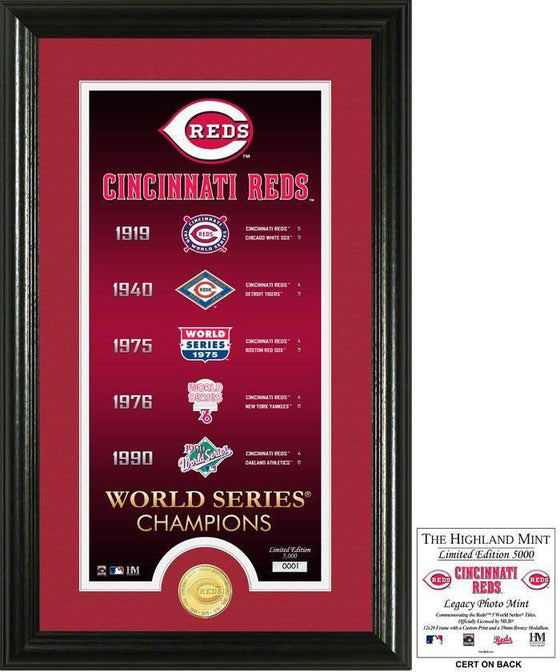 A Limited Edition commemorating the Cincinnati Reds World Series Championships! This 12”x 20” Frame with double matting and a glass front panel features a custom and individually numbered 15” x 7” commemorative photo listing each of their World Series and a minted 39mm solid bronze team commemorative coin. A limited edition of only 5000, each Photo is hand numbered and each frame is accompanied by a certificate of authenticity. This item is officially licensed by the MLB and proudly made in the U.S.A. by The Highland Mint.Products are made to order and my have handling time of upto 5-10 days, but usually handling time is about 3-5 days.