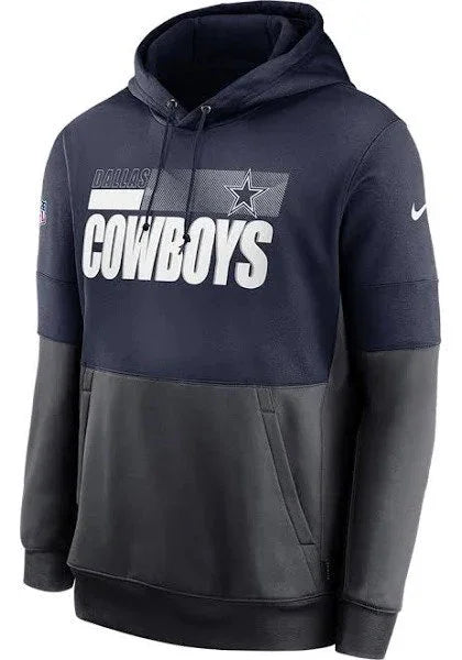 The Dallas Cowboys Nike Mens Team Name Lockup Therma Fleece Hoodie is a Therma fleece hoodie with a contrast lower body and lower sleeves and screen printed team graphic.