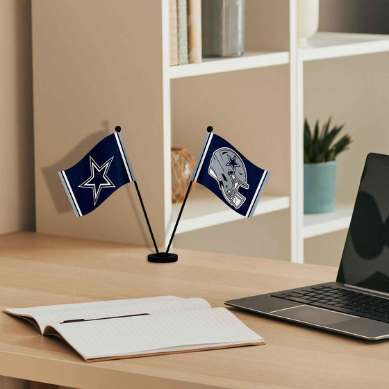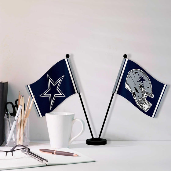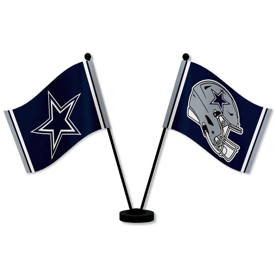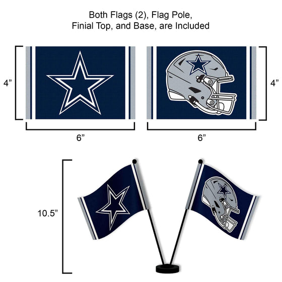 Details: These small team desk flags are a great way to show your team allegiance on any table top at the office or at home. Each flag measure 4x6 inches, is screen printed, and is made of 100d Polyester. The poles are 11 inches in height, the 2 hole base is 2.25 inches in diameter and is made of PVC plastic. Plastic Poles and Finial Tops are included and made of plastic. This set of desk flags are Officially Licensed and Team, School, University or College Approved.