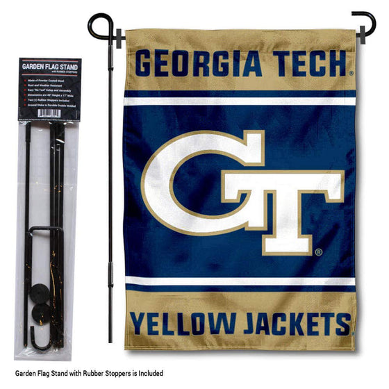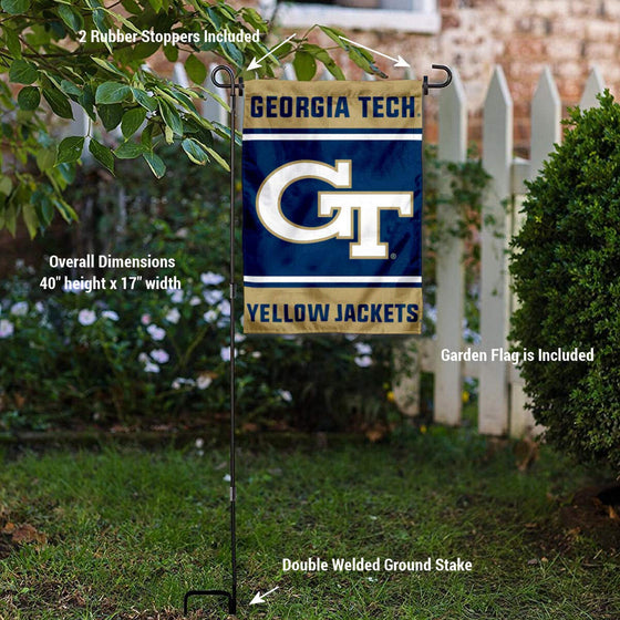 Details: This Flag, Banner or Pennant is an ideal set for your yard or home entrance. It includes your selected 13 in x 18 in Double Sided Georgia Tech Garden Flag along with a Sturdy Steel Powder Coated Garden Flag Stand with 2 included Rubber Stoppers. The garden flag measures 13 in x 18 in, is made of 2-ply Polyester with Sewn-In Liner, is Screen Printed, has a top pole sleeve for inserting the included Garden Flag Stand, and the logos are Viewable and Readable Correctly on Both Sides. The Garden Flag Stand measures an assembled height of 40" and has a flag crossbar width of a large 17". Also, the stand is made of steel, is powder coated black for rust resistance, and the ground stake is made with double welds for extra durability. A unique gift, our Flag, Banner or Pennant is ready to fly and no tools are needed for assembly. The Flag is Officially Licensed and Team, College, or University Approved Approved.
