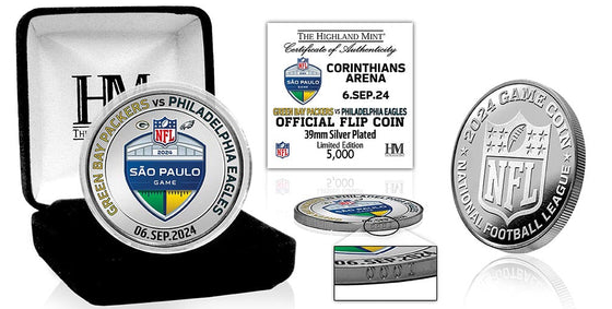 This is the coin used for the official coin toss by the referee for the 2024 Sao Paulo Game played between the Green Bay Packers vs Philadelphia Eagles. You can own a replica of the same coin that is minted and finished with selective color and fine silver plating. The coin measuring 39mm in diameter features the Sao Paulo Game logo with the teams and date on the obverse and the Official NFL logo on the reverse. The coins are individually numbered on the edge, protected in a clear capsule to preserve its condition and as a limited mintage of only 5000 per game and officially licensed by the NFL, each one is accompanied by a certificate of authenticity. Proudly made in the USA by The Highland Mint!
