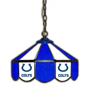 Perfect for over the Bar this Indianapolis Colts 14-in. Stained Glass Pub Light. Beautifully handcrafted 14-inch diameter old world Tiffany style stained glass hanging pub light. Each piece of glass is individually cut by hand and individually placed by hand. It is then soldered into its proper position with great care and precision by highly trained artists. Fully wired with 1 UL Approved high-quality porcelain light socket and a 12-foot cord with inline switch and polarized plug. 9-feet of heavy duty antique brass chain adds a touch of luxury to the lamp. Handmade in the USA. Chain and ceiling mounting hardware not included. The bulb is not included. The lamp measures 14" wide x 10" high; weighs 12 pounds. This product is made to order. Made to order please allow 3-4 weeks for shipping.