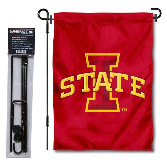 Details: Iowa State Cyclones Yard Flag and USA Flag Stand Pole Holder Set is an ideal set for your yard, garden, walkway, mailbox, or home entrance. This bundle includes your selected 13" x 18" Double Sided College Garden Flag, a Single Ply 12 x 18 inch USA Garden Flag, and a Sturdy Steel Powder Coated Garden Flag Stand with 2 included Rubber Stoppers. The garden flag measures 13x18 inches, is made of 2-Ply Polyester with sewn-in liner, is Double Sided Screen Printed, has a top pole sleeve for inserting the included Garden Flag Holder. The Garden Flag Stand measures an assembled height of 40" and has a flag crossbar width of a large 17". Also, the stand is made of steel, is powder coated black for rust resistance, and the ground stake is made with double welds for extra durability. A unique gift, our set is ready to fly and no tools are needed for assembly. The Flag is Officially Licensed and College and University Approved.