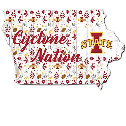 Details: Iowa State Cyclones State shped sign with team logo and floral pattern. Decorative team sign. Great for any room. Show team pride. American made sign.