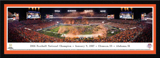 This panorama captures Clemson's victory celebration from what many claim to be one of the best college championship games ever between the two top ranked teams of the 2016 season - the Clemson Tigers and the Alabama Crimson Tide. Clemson claimed consecutive ACC titles for the first time in 28 years, crushed Ohio State 31-0 in the playoffs and finally accomplished what most have only dreamed of, ending Alabama's twenty-six game undefeated streak and upending the Crimson Tide’s quest for another national championship. This is Clemson's first national championship in 35 years, and an especially rewarding victory, as they claimed the title over rival Alabama in this championship title rematch.Panoramics are 13.5"x40". When framed, about 2-3 inches are added to each side. Allow 1-3 business days handling time.