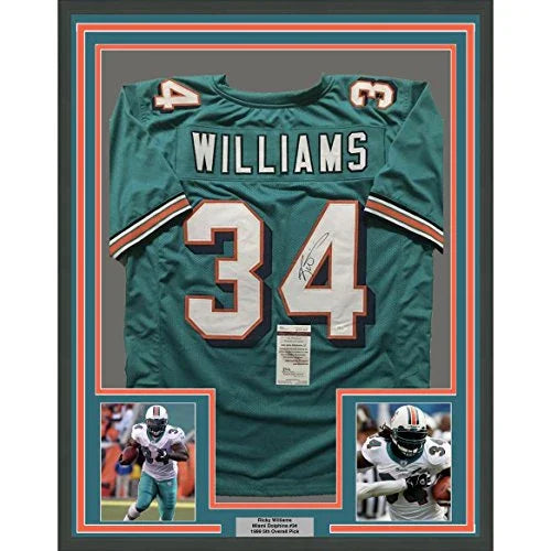 Framed Autographed/Signed Ricky Williams 33x42 Miami Dolphins Teal Football Jersey JSA COA Framed Autographed/Signed Ricky Williams 33x42 Miami Dolphins Teal Football Jersey JSA COA - 757 Sports Collectibles