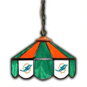 Perfect for over the Bar this Miami Dolphins 14-in. Stained Glass Pub Light. Beautifully handcrafted 14-inch diameter old world Tiffany style stained glass hanging pub light. Each piece of glass is individually cut by hand and individually placed by hand. It is then soldered into its proper position with great care and precision by highly trained artists. Fully wired with 1 UL Approved high-quality porcelain light socket and a 12-foot cord with inline switch and polarized plug. 9-feet of heavy duty antique brass chain adds a touch of luxury to the lamp. Handmade in the USA. Chain and ceiling mounting hardware not included. The bulb is not included. The lamp measures 14" wide x 10" high; weighs 12 pounds. This product is made to order. Made to order please allow 3-4 weeks for shipping.