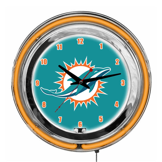 Make your fan room glow with this 14"Â Miami Dolphins Neon Clock, with an inner band of white neon to brighten the face of the clock and an outer band in your favorite team's color.