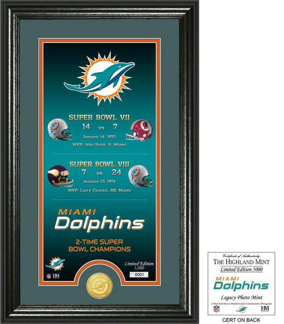 Commemorating the Miami Dolphins and their 2 Super Bowl Titles!  Featured in a 12" x 20" frame with a glass front panel and double matting is a 15" x 7" hand numbered commemorative photo. The photo design includes the the Dolphins team logo as well as the Dolphins and their opponents dueling helmets with the scores, dates and MVP's from each of their Super Bowl titles. Highlighting this unique collectible frame is a 39mm bronze 2-time Super Bowl Champions coin. This is a limited edition of 5000. Officially licensed by NFL and proudly made in the U.S.A. by The Highland Mint.