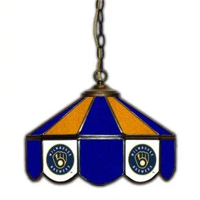 Perfect for over the Bar this Milwaukee Brewers 14-in. Stained Glass Pub Light. Beautifully handcrafted 14-inch diameter old world Tiffany style stained glass hanging pub light. Each piece of glass is individually cut by hand and individually placed by hand. It is then soldered into its proper position with great care and precision by highly trained artists. Fully wired with 1 UL Approved high-quality porcelain light socket and a 12-foot cord with inline switch and polarized plug. 9-feet of heavy duty antique brass chain adds a touch of luxury to the lamp. Handmade in the USA. Chain and ceiling mounting hardware not included. The bulb is not included. The lamp measures 14" wide x 10" high; weighs 12 pounds. This product is made to order. Made to order please allow 3-4 weeks for shipping.