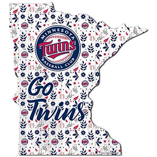 Details: Minnesota Twins State shped sign with team logo and floral pattern. Decorative team sign. Great for any room. Show team pride. American made sign.