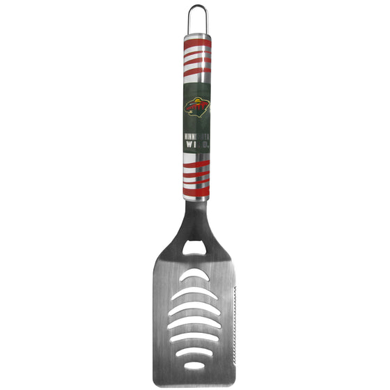 Enhance your tailgating experience with our striking Minnesota Wild tailgater spatula, featuring eye-catching chrome accents and vibrant digital graphics. Crafted from durable 430 grade stainless steel, this heavy-duty spatula is built to withstand countless tailgating events. It includes a convenient bottle opener and a sharp serrated edge, making it the ultimate tool for grilling enthusiasts and Minnesota Wild fans alike. Get ready to impress at your next outdoor gathering.
