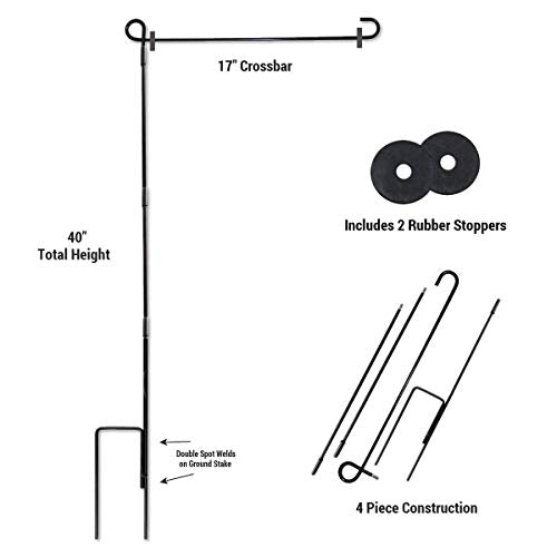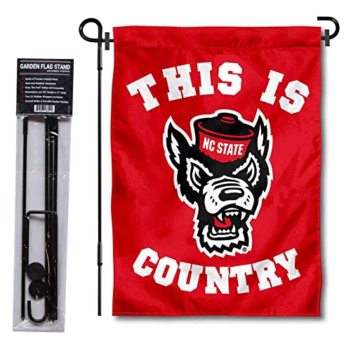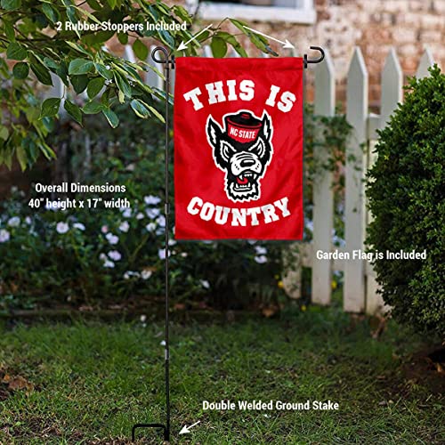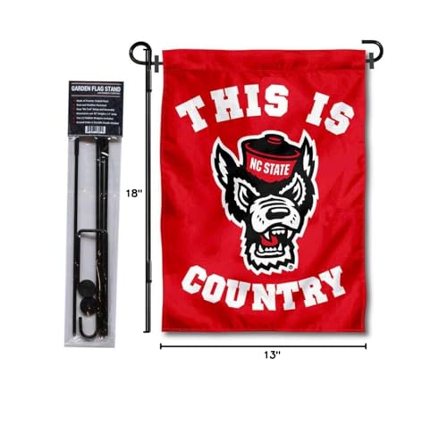 Details: This is NC State Wolfpack Country Garden Flag and Flag Stand Pole Holder Set is an ideal set for your yard, garden, walkway, mailbox, or home entrance. This bundle includes your selected 13" x 18" Double Sided College Garden Flag along with a Sturdy Steel Powder Coated Garden Flag Stand with 2 included Rubber Stoppers. The garden flag measures 13x18 inches, is made of 2-Ply Polyester with sewn-in liner, is Double Sided Screen Printed, has a top pole sleeve for inserting the included Garden Flag Holder.The Garden Flag Stand measures an assembled height of 40" and has a flag crossbar width of a large 17". Also, the stand is made of steel, is powder coated black for rust resistance, and the ground stake is made with double welds for extra durability. A unique gift, our set is ready to fly and no tools are needed for assembly. The Flag is Officially Licensed and College and University Approved.