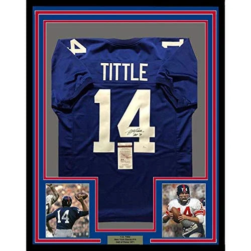 Framed Autographed/Signed YA Y.A. Tittle"HOF 71" 33x42 New York Giants Blue Football Jersey JSA COA Framed Autographed/Signed YA Y.A. Tittle"HOF 71" 33x42 New York Giants Blue Football Jersey JSA COA - 757 Sports Collectibles