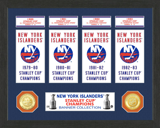 Commemorating the Islanders Four Stanley Cup Championships with a commemorative banner for each season and minted coins. Featured in a 15 x 12 wood frame withacid free mattingis a banner commemorating each title. Along with the banner is a fact card matted above each one. Matted below the banners is a 39mm minted New York Islanders bronze coin and a 39mmminted NHL Commemorative coin.Each frame has a certificate of authenticity adhered to the back. Officially licensed by the NHL and proudly made in the USA by The Highland Mint!
