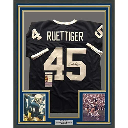 Framed Autographed/Signed Rudy Ruettiger 33x42 Notre Dame Fighting Irish Blue College Football Jersey JSA COA Framed Autographed/Signed Rudy Ruettiger 33x42 Notre Dame Fighting Irish Blue College Football Jersey JSA COA - 757 Sports Collectibles