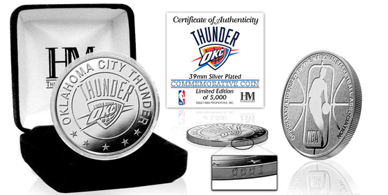 This 39mm silver plated Commemorates your favorite NBA Team! Showing your favorite teams official logo at the center of the coin, Reverse (back) of the coin is struck with the official NBA logo. Each silver-plated coin is protected in a clear capsule to preserve its condition and delivered in a black velour jewelry display box. With a limited edition of only 5000, each coin is individually struck with a serial number on its edge and accompanied by a certificate of authenticity. It is officially licensed by NBA and proudly made in the USA by The Highland Mint.
