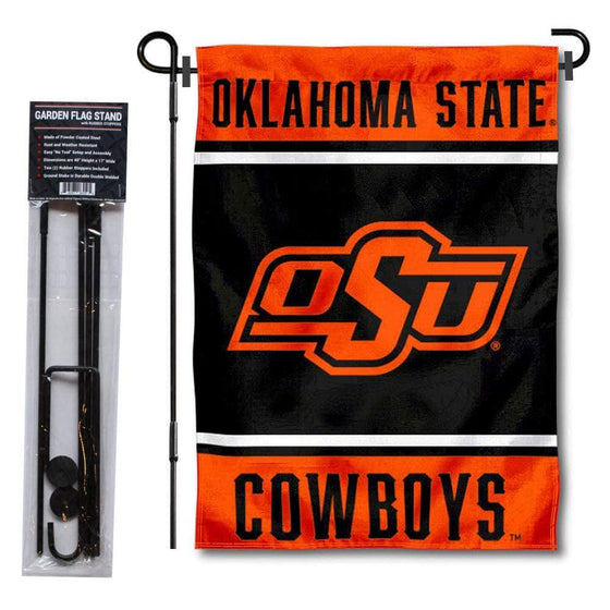 Details: Oklahoma State Cowboys Garden Flag and Flag Stand Pole Holder Set is an ideal set for your yard, garden, walkway, mailbox, or home entrance. This bundle includes your selected 13" x 18" Double Sided College Garden Flag along with a Sturdy Steel Powder Coated Garden Flag Stand with 2 included Rubber Stoppers. The garden flag measures 13x18 inches, is made of 2-Ply Polyester with sewn-in liner, is Double Sided Screen Printed, has a top pole sleeve for inserting the included Garden Flag Holder. The Garden Flag Stand measures an assembled height of 40" and has a flag crossbar width of a large 17". Also, the stand is made of steel, is powder coated black for rust resistance, and the ground stake is made with double welds for extra durability. A unique gift, our set is ready to fly and no tools are needed for assembly. The Flag is Officially Licensed and College and University Approved.