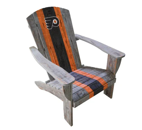 Time to show your favorite team as you enjoy the great outdoors on your new NHL Officially Licensed distressed wood Adirondack chair. The chair has the team colors painted stripes on back and seat. Large logo on the back of the chair. Assembled dimensions: 37.5â€L x 34â€W x 30.5â€H; weight 32 pounds. Ships small parcel.