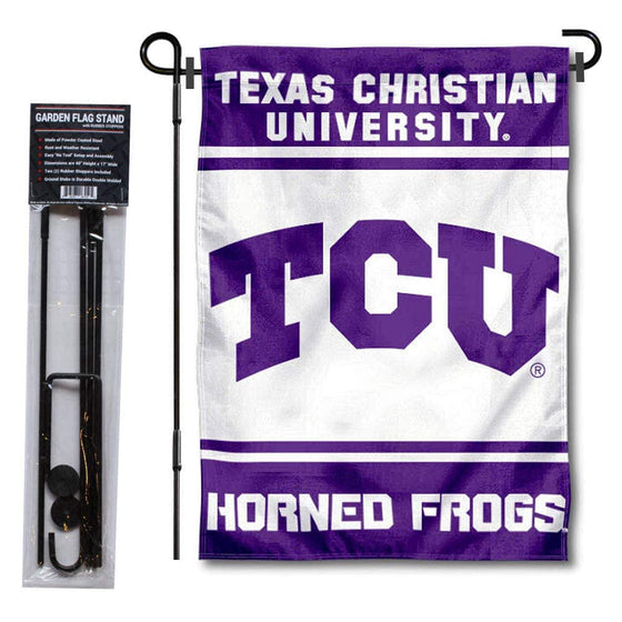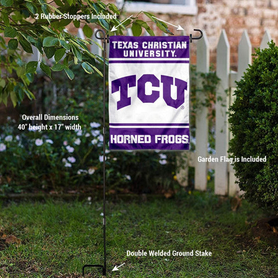 Details: TCU Horned Frogs Garden Flag and USA Flag Stand Pole Holder Set is an ideal set for your yard, garden, walkway, mailbox, or home entrance. This bundle includes your selected 13" x 18" Double Sided College Garden Flag, a Single Ply 12 x 18 inch USA Garden Flag, and a Sturdy Steel Powder Coated Garden Flag Stand with 2 included Rubber Stoppers. The garden flag measures 13x18 inches, is made of 2-Ply Polyester with sewn-in liner, is Double Sided Screen Printed, has a top pole sleeve for inserting the included Garden Flag Holder. The Garden Flag Stand measures an assembled height of 40" and has a flag crossbar width of a large 17". Also, the stand is made of steel, is powder coated black for rust resistance, and the ground stake is made with double welds for extra durability. A unique gift, our set is ready to fly and no tools are needed for assembly. The Flag is Officially Licensed and College and University Approved.