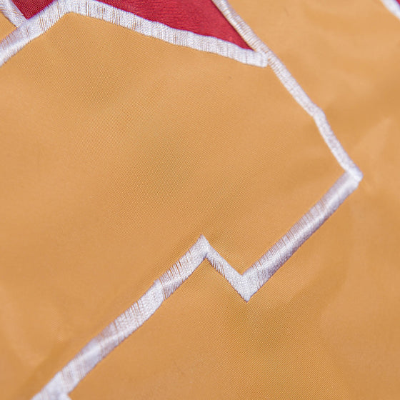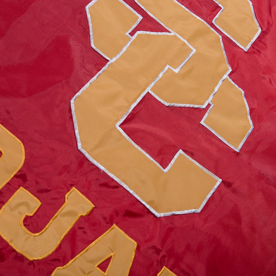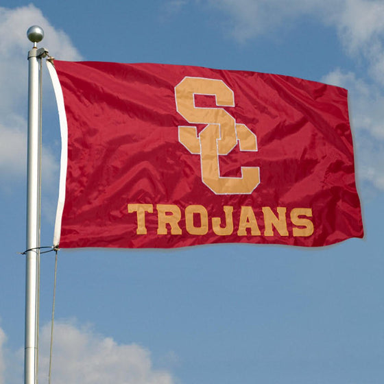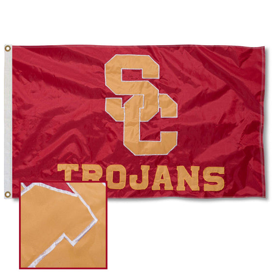 Details: Our Flag, Banner or Pennant measures 3 ft x 5 ft in size, has Quadruple Stitched fly ends, is made of durable Nylon, and has two Metal Grommets for attaching to your flagpole. The Embroidered and Appliqued Southern Cal USC Trojans logos are applied via our 2-patch applique method, therefore, one patch is sewn on each side of the flag. These flags are Officially Licensed and College, University, or Team Approved and are Viewable from Both Sides (Opposite Side is a Reverse Image).