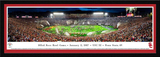 This panorama spotlights the culmination of an exciting day of football as the USC Trojans celebrated victory over the Penn State Nittany Lions at the 103rd edition of the legendary Rose Bowl Game in Pasadena, California. USC's motivation entering the game was high, having achieved the best regular-season record in the Pac-12, and completing the season with nine straight wins; a feat few teams can say they have accomplished. First played in 1902 and celebrating over a century in the making, the Rose Bowl Game is aptly nicknamed “The Granddaddy of Them All", as the oldest bowl game in college football.Panoramics are 13.5"x40". When framed, about 2-3 inches are added to each side. Allow 1-3 business days handling time.