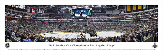 This panorama, taken by Christopher Gjevre, spotlights the Los Angeles Kings - Center Ice® as they claim the 2014 Stanley Cup® in Game 5, with an exciting 3-2 victory over the New York Rangers®. The Kings - Center Ice arrived at the 2014 Stanley Cup Final after surviving the Western Conference gauntlet and beating three of the top seven teams in the NHL®. Making their first appearance in the Final in 1993, they are taking home their second Stanley Cup Championship in three seasons. On June 1, 2014, the Kings - Center Ice became the first NHL team to ever reach the Stanley Cup Final having played three consecutive seven-game series. They are also the first in Playoff history to win three straight games, in which they trailed by more than one goal.Panoramics are 13.5"x40". When framed, about 2-3 inches are added to each side. Allow 1-3 business days handling time.