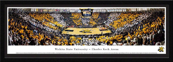 Shocker fans came dressed for the first three-color stripe-out to celebrate the start of a new era and cheer on their Wichita State men's basketball team, as they handily defeated the Houston Cougars 81-63 in their inaugural home opener in the American Athletic Conference.  A capacity crowd of 10,506 fans filled Charles Koch Arena at this nationally televised event.  The move to the AAC was seen as beneficial to both the conference and team, as it adds a perennial national contender to the American Athletic Conference, raising its basketball profile.Panoramics are 13.5"x40". When framed, about 2-3 inches are added to each side. Allow 1-3 business days handling time.