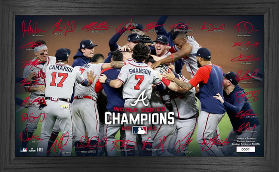 This limited edition collectible frame celebrates 2021 World Series Champions, the Atlanta Braves! This 12" x 20" frame features under plexi glass a 10” x 18” hand numbered collectible photo with the 2021 Atlanta Braves players facsimile (replica) signatures placed around an image of the team celebrating their huge win on the field at the end of the game. A limited edition of only 5000 and officially licensed by MLB, each photo is accompanied by a certificate of authenticity making this a true collectible. Proudly made in the USA