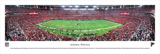This panorama, taken by James Blakeway, captures the Atlanta Falcons playing for a win at the Georgia Dome. On June 30, 1965, one of the most significant days in Atlanta's sports history, the National Football League awarded its 15th franchise to the city. Excited fans showed their enthusiasm by purchasing 45,000 season tickets in a brief 54-day period with almost no promotion; an NFL record for a new team. "Falcons" was suggested by many, with reasons from a school teacher from Griffin, Georgia, singled out. Miss Julia Elliott said, "The Falcon is proud and dignified, with great courage and fight. It never drops its prey. It is deadly and has a great sporting tradition."