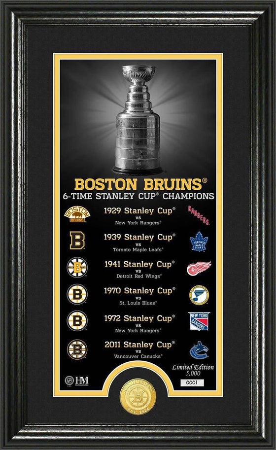 A Limited Edition commemorating the 6-time Stanley Cup Champion Boston Bruins! This 12”x 20” Frame with double matting and a glass front panel features a custom and individually numbered 15” x 7” commemorative photo listing each of their Stanley Cups and a minted 39mm solid bronze 15-time team commemorative coin. A limited edition of only 5000, each Photo is hand numbered and each frame is accompanied by a certificate of authenticity. This item is officially licensed by the NHL and proudly made in the U.S.A. by The Highland Mint.Products are made to order and my have handling time of upto 5-10 days, but usually handling time is about 3-5 days.