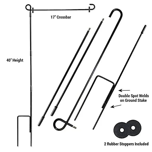 Details: Columbia Lions Shield Garden Flag and Flag Stand Pole Holder Set is an ideal set for your yard, garden, walkway, mailbox, or home entrance. This bundle includes your selected 13" x 18" Double Sided College Garden Flag along with a Sturdy Steel Powder Coated Garden Flag Stand with 2 included Rubber Stoppers. The garden flag measures 13x18 inches, is made of 2-Ply Polyester with sewn-in liner, is Double Sided Screen Printed, has a top pole sleeve for inserting the included Garden Flag Holder. The Garden Flag Stand measures an assembled height of 40" and has a flag crossbar width of a large 17". Also, the stand is made of steel, is powder coated black for rust resistance, and the ground stake is made with double welds for extra durability. A unique gift, our set is ready to fly and no tools are needed for assembly. The Flag is Officially Licensed and College and University Approved.