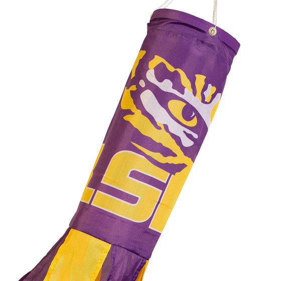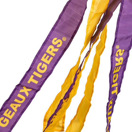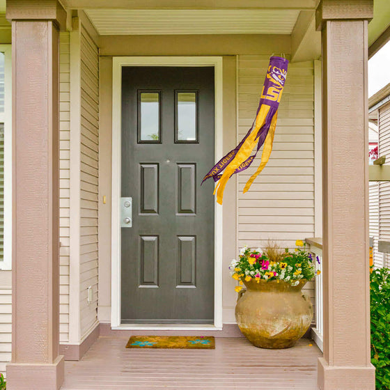 Details: This Windsock with six (6) alternating colored tails and streamers is constructed of 100% polyester and measures roughly 40 inches in length with a top bridle diameter of 5 inches. Each wind sock includes officially licensed school logos and names which are screen printed into the college wind sock and three (3) streamers include team names or slogans, if shown. In addition, the windsock is double stringed and includes a plastic rotating hanging clip, for easy setup. College Windsocks are a unique way to display your team spirit by hanging from your front or back porch, patio, mailbox, or flag pole and are perfect for home decoration, tailgate parties, and make great gifts for relatives, neighbors, or yourself. These College Windsocks are Approved and Licensed by Team, College, or University.