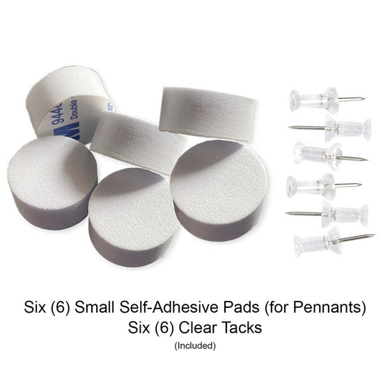 Details: This logo banner set is a great way to show your team allegiance in your sports room, game room, office, bedroom, fan cave, garage, or any room by displaying on any wall. These pennant flags measure a full size 12 in X 30 in, are made of Felt, and are single-sided Screen Printed with the insignias and logos, as shown. Each banner is Officially Licensed by the selected team which insures current insignias, wordmarks, and authentic colors. Also, a pack of 6 Wall Pads and 6 Tacks are included which enable you to display on any wall. This ready to hang kit provides the pennant with a drop shadow while the tacks attach your pennant to the 3/8 inch thick adhesive wall pads. Easy directions are to find the location on the your wall to display your pennant. Hold and press each adhesive pad for 30 seconds. Use included tacks to display your pennant by pressing the corners into each pad.