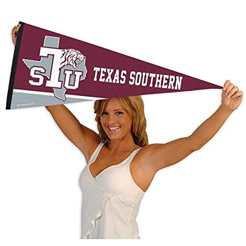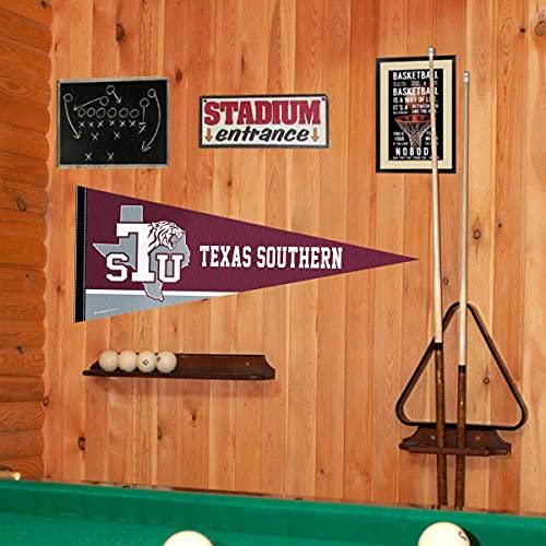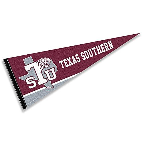 Details: Our Texas Southern Tigers Pennants are an easy way to show your college team allegiance in your sports room, game room, office, bedroom, or any room by displaying on any wall. These college pennants measure a full size 12x30 inches, are made of felt, and are single-sided screen printed with the school insignias and logos, as shown. Each Texas Southern Pennant Full Size Felt is Officially Licensed by the selected team and Texas Southern University which insures current school insignias, wordmarks, and authentic college colors. The League pennants also include a pennant sleeve on the left side which can be used to insert a pennant stick, if desired.
