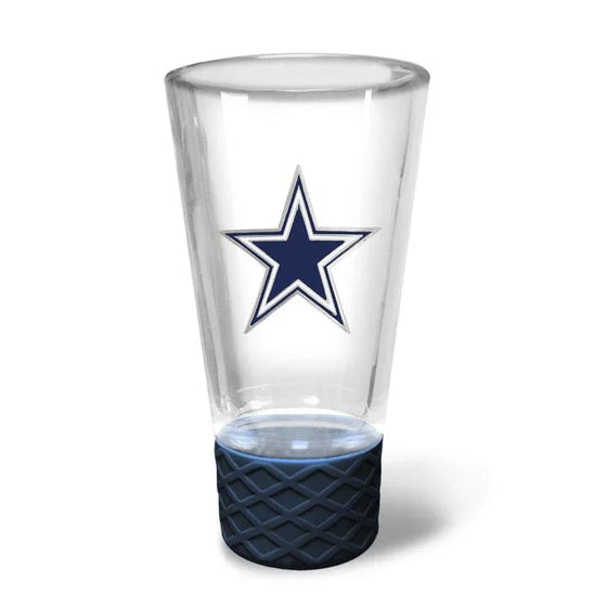 This 4 oz. round glass shot has a 3-dimensional team emblem with a team color silicone grip.