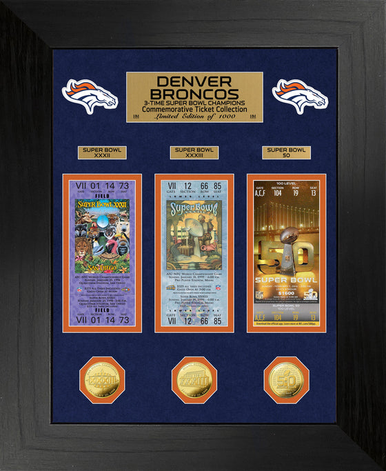 A limited edition of only 1,000! Featured in a black 22" x 18" wood frame with 2.5" wide molding and double matting is the Denver Broncos replica Super Bowl ticket collection! Included are each of the respective Super Bowl coins minted in gold plate each measuring 39mm in diameter. Also matted in the frame are engraved nameplates and die cut team logos. Each frame has an individually numbered certificate of authenticity adhered to the back. Officially licensed by the NFL and proudly made in the U.S.A by The Highland Mint!