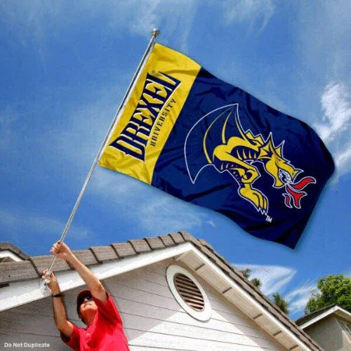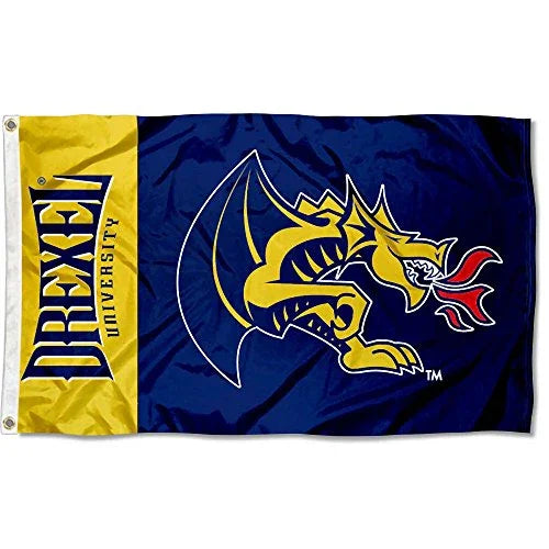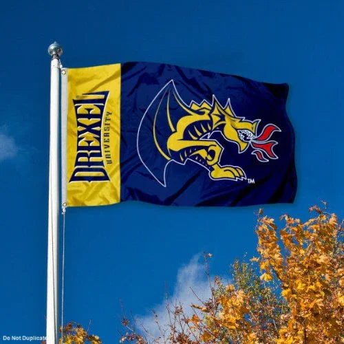 Details: Our Drexel Dragons Flag measures 3x5 feet in size, has quadruple-stitched fly ends, is made of durable polyester, and has two metal grommets for attaching to your flagpole. The screen printed DU Dragons logos are Officially Licensed and Approved by Drexel University and are viewable from both sides with the opposite side being a reverse image.