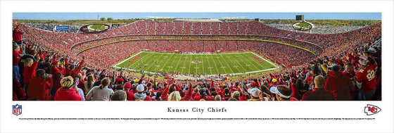 This panorama of the Kansas City Chiefs, taken by James Blakeway, captures fan excitement at Arrowhead Stadium, as the Chiefs score a touchdown on their way to a victory over the Cleveland Browns. The Chiefs played their inaugural game at Arrowhead Stadium on August 12, 1972 and today Arrowhead has stood the test of time as one of the nation’s top venues for fans to experience the excitement of professional football. Founded in Dallas in 1960, the club relocated to Kansas City, Missouri, in 1963 and was renamed the Kansas City Chiefs. In 1969, the Chiefs became the only club in AFL history to win three AFL Championships. The Chiefs went on to victory in Super Bowl IV in January 1970.