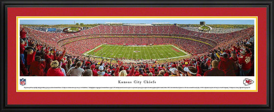This panorama of the Kansas City Chiefs, taken by James Blakeway, captures fan excitement at Arrowhead Stadium, as the Chiefs score a touchdown on their way to a victory over the Cleveland Browns. The Chiefs played their inaugural game at Arrowhead Stadium on August 12, 1972 and today Arrowhead has stood the test of time as one of the nation’s top venues for fans to experience the excitement of professional football. Founded in Dallas in 1960, the club relocated to Kansas City, Missouri, in 1963 and was renamed the Kansas City Chiefs. In 1969, the Chiefs became the only club in AFL history to win three AFL Championships. The Chiefs went on to victory in Super Bowl IV in January 1970.