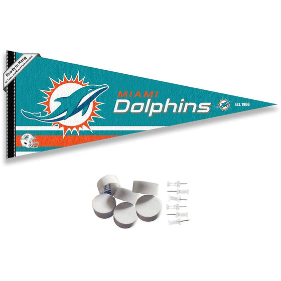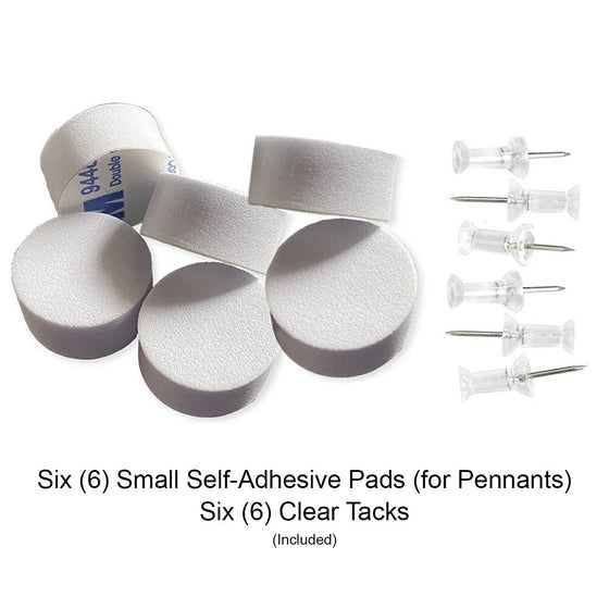 Details: This logo banner set is a great way to show your team allegiance in your sports room, game room, office, bedroom, fan cave, garage, or any room by displaying on any wall. These pennant flags measure a full size 12 in X 30 in, are made of Felt Blend, and are single-sided Screen Printed with the insignias and logos, as shown. Each banner is Officially Licensed by the selected team which insures current insignias, wordmarks, and authentic colors. Also, a pack of 6 Wall Pads and 6 Tacks are included which enable you to display on any wall. This ready to hang kit provides the pennant with a drop shadow while the tacks attach your pennant to the 3/8 inch thick adhesive wall pads. Easy directions are to find the location on the your wall to display your pennant. Hold and press each adhesive pad for 30 seconds. Use included tacks to display your pennant by pressing the corners into each pad.