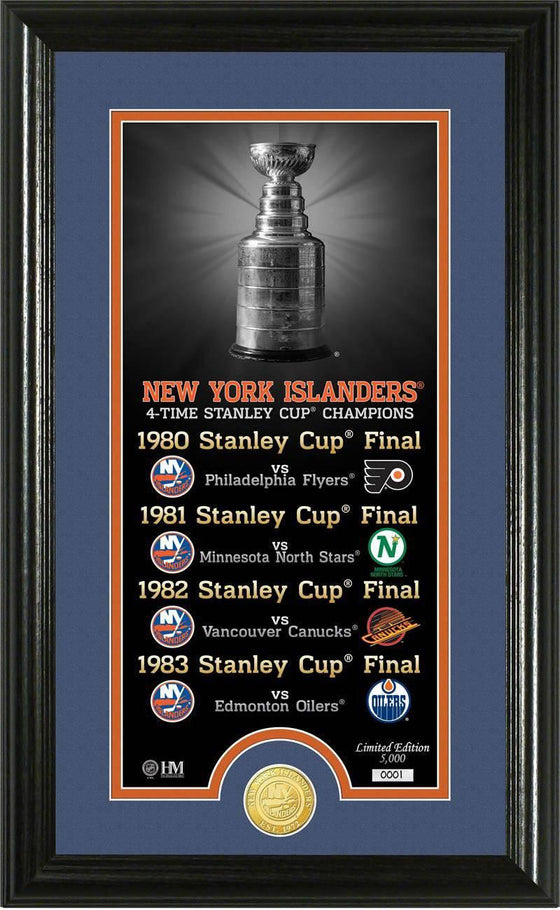 A Limited Edition commemorating the 4-time Stanley Cup Champion New York Islanders! This 12”x 20” Frame with double matting and a glass front panel features a custom and individually numbered 15” x 7” commemorative photo listing each of their Stanley Cups and a minted 39mm solid bronze 4-time team commemorative coin. A limited edition of only 5000, each Photo is hand numbered and each frame is accompanied by a certificate of authenticity. This item is officially licensed by the NHL and proudly made in the U.S.A. by The Highland Mint.Products are made to order and my have handling time of upto 5-10 days, but usually handling time is about 3-5 days.