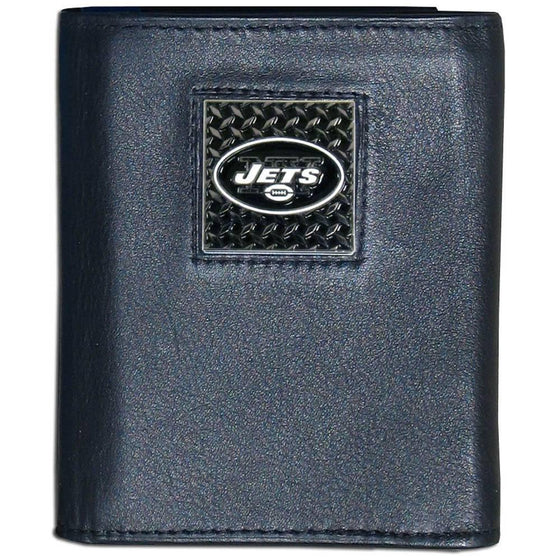 Discover the ultimate sports gift for any New York Jets fan with our officially licensed fine grain leather wallet. This high-quality sports memorabilia piece is designed with numerous card slots, including windowed ID slots and removable picture holders, ensuring ample space for all your essentials. Show off your team pride in style with the sleek design featuring a striking metal New York Jets emblem, complete with enameled team colors.