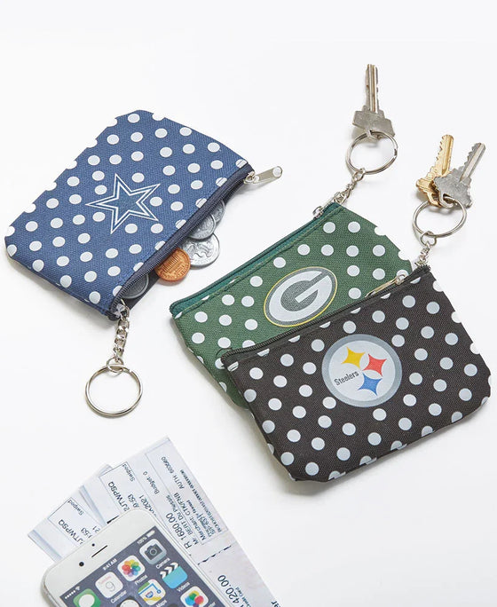 An NFL Polka Dot Coin Purse in team colors with the team logo on the front is sure to be appreciated by any NFL fan. It features a zip closure to allow easy access to coins or cards. It has a clear plastic slot for your ID to show through. Attached key ring.